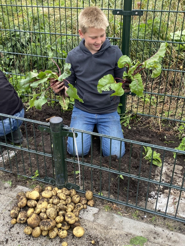 Buiten hebben alle kinderen hun eigen moestuintje. Vanaf ongeveer maart zijn we daar bijna wekelijks te vinden. Van het omspitten van de grond tot het oogsten van onze eigen groente: het blijft een mooi proces om met de kinderen te ervaren. Samen kijken we hoe alles groeit, verwonderen we ons over de schepping en leren de kinderen zorg te dragen voor hun eigen tuintje. Onkruid wieden, water geven, naambordjes maken en het leukste moment: oogsten! Het levert ieder jaar weer trotse gezichten op.